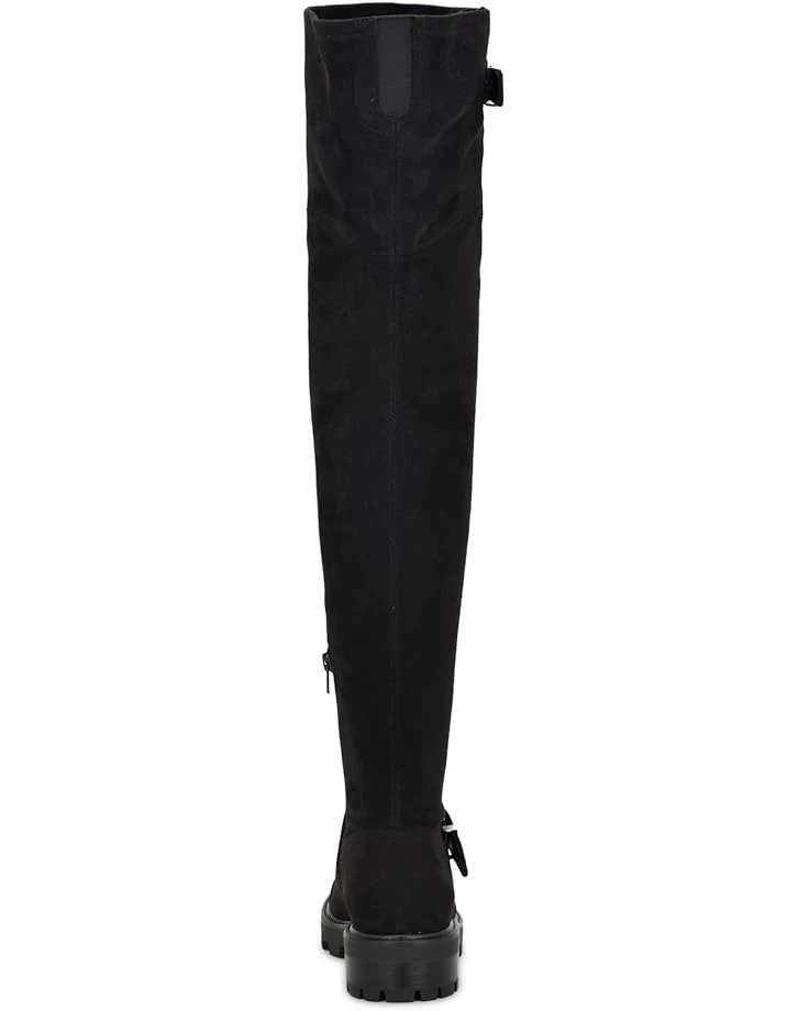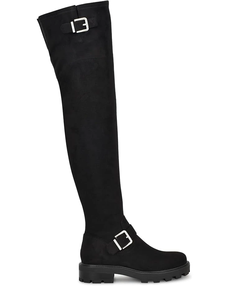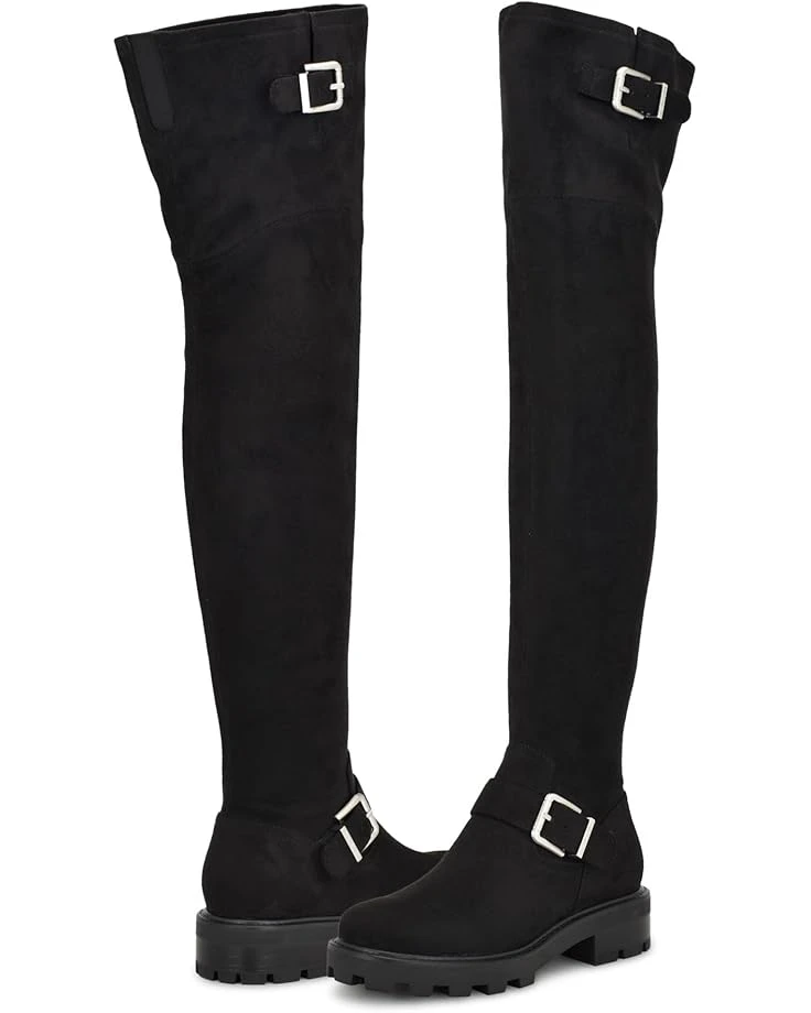 - Make a bold fashion statement with the Nine West® Nans boots. These above-the-knee boots feature a striking lug sole bottom and a sturdy block heel, ensuring you stand tall and confident wherever you go. The round-shaped toe offers comfort and style, while decorative buckle straps add a touch of edge to your look.