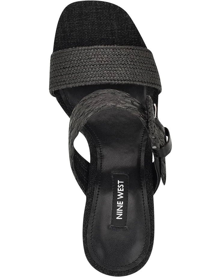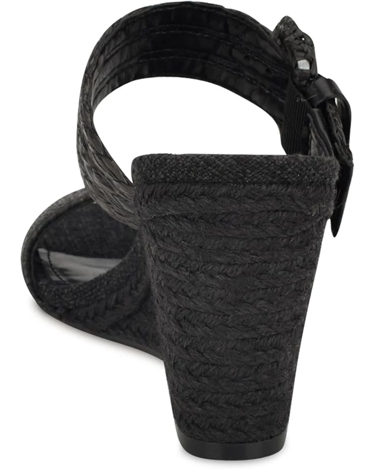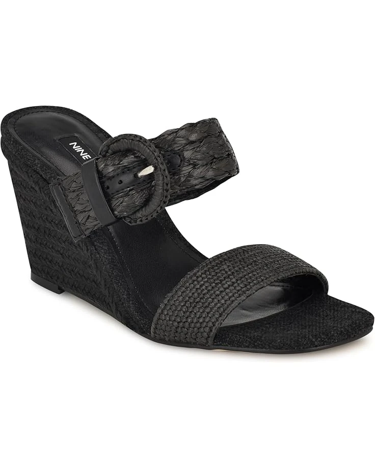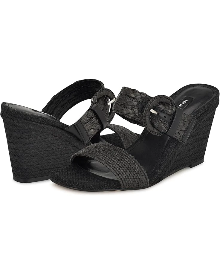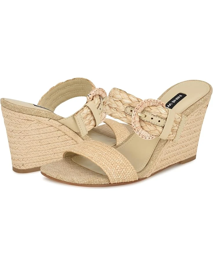 - Step into summer with effortless style in Nine West® Novalie sandals. Boasting an open square toe and chic woven straps, these sandals exude a sense of casual elegance. The buckle detail on the foot strap adds a touch of sophistication, while the espadrille-style jute-wrapped wedge heel offers both height and comfort.