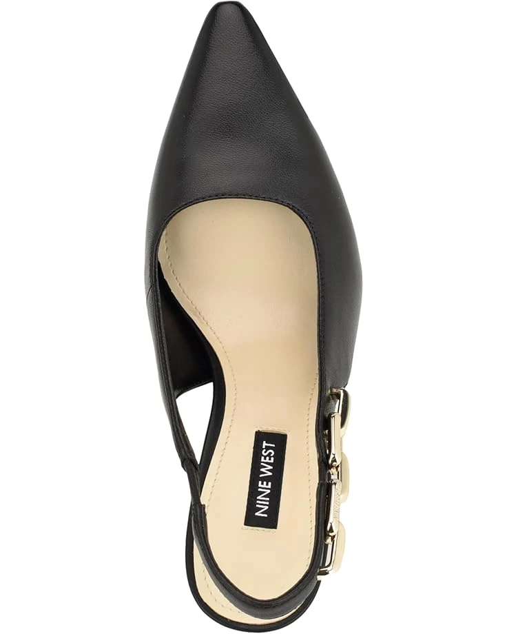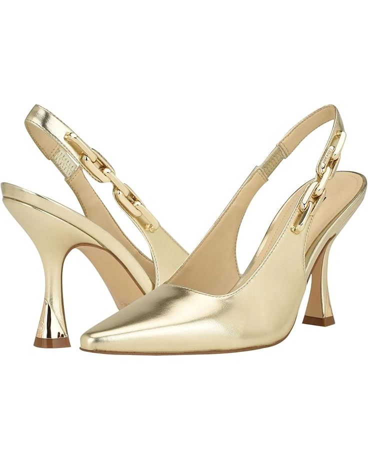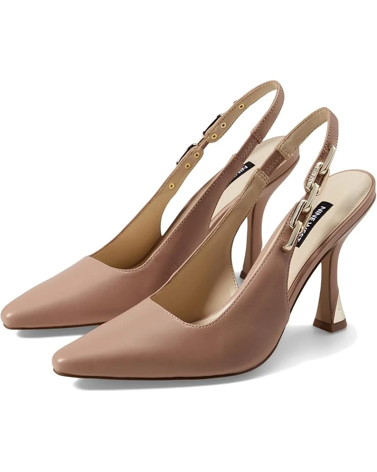 - Walk the journey to elegance wearing the Nine West® Veroni. Crafted from faux leather upper, this pair of stiletto heels features slip-on style, slingback strap with gold chain detailing, and pointed toe.